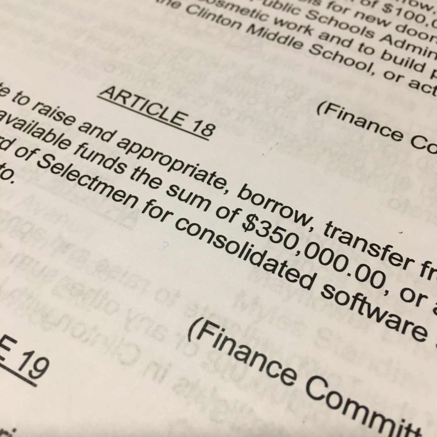 The issue in question was Article 18, asking to borrow $350,000 for a consolidated software suite for the town.